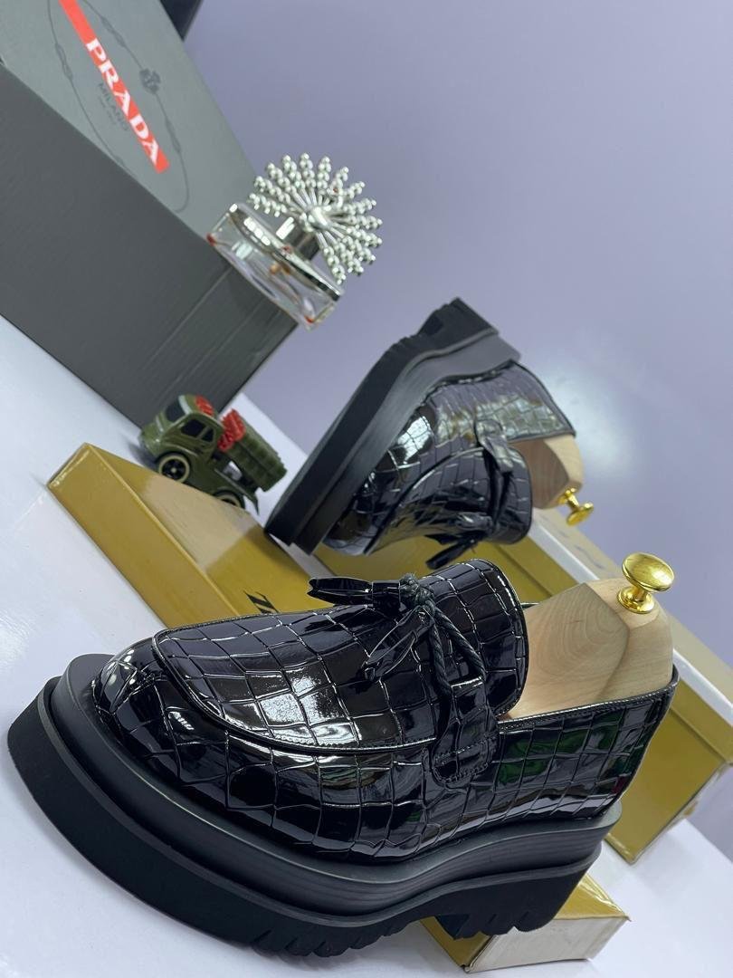 Prada Croc-Effect Platform Loafers – Black Patent Leather