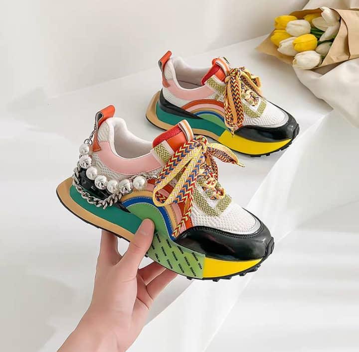 Women’s Rainbow Chunky Platform Sneakers with Pearl Chain